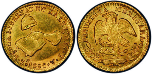 This coin has the facing eagle style used for both years of Zacatecas production. The dies were likely made at the Soho mint in England. This 1860 Zs VL Zacatecas half escudo in Mint 63 is tied fi nest known for the date and tied fi nest known for the mint.