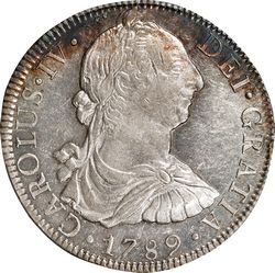 The coins of 1789 and 1790 bear the bust of Charles III, not his successor Charles IV. In view of the high costs and delays in manufacturing and transporting stamps from Spain to America, an order of 24 December 1788 authorized the addition of one more Roman numeral, thus changing the inscription to read CAROLVS IIII. Coins of this type were struck in Mexico during 1789 and 1790.