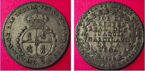In the turbulent reign of Fernando VII, there were many more medals in this category than in prior reigns. The reason is the greater number of political events occurring on the Iberian peninsula, and in Mexico, at the time.