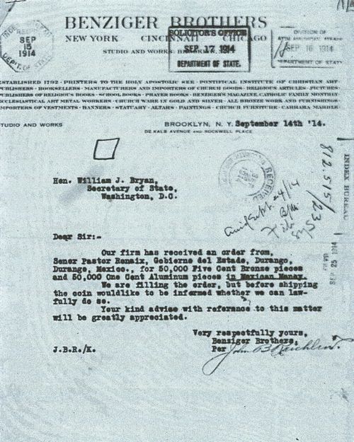 The first of the letters was sent from John B. Reichlin at Benziger Brothers in Brooklyn, New York on 14 September 1914 to William J. Bryan who was the U.S. Secretary of State from 1913-15 under Woodrow Wilson. The letter mentions that an order to mint the coins was received from “Senor Pastor Ronaix, Gobierno del Estado, Durango”. Benziger actually misspelled or simply misinterpreted the last name since the real name of the requestor was Pastor Rouaix who was the Provisional Governor of Durango at that time and served in that capacity from 4 July 1913 until 25 August 1914, when another revolutionary leader, Domingo Arrieta, forced his resignation. It is quite possible that Mr. Rouaix’s successor was not even aware of this agreement with Benziger to mint the coins, or if he was aware, he appears to have made no effort to cancel or modify the agreement. Benziger Brothers finally state that they are going to fulfill the order as requested by Mr. Rouaix, but would like to know whether they can lawfully ship the coins and would greatly appreciate their (Secretary of State) advice on this matter.