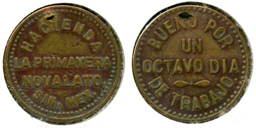 Obverse: HACIENDA / LA PRIMAVERA / NOVALATO / SIN, MEX.