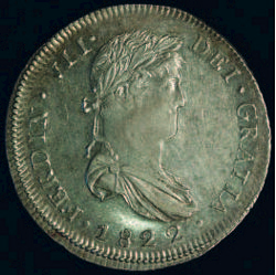 | 1822 RG | Mexican independence was declared on 28 September 1821 and Iturbide’s imperial rule began in May 1822. Striking of the 1822 Draped Bust issue continued after Iturbide Imperial coinage began in mid-1822. There is evidence that Zacatecas mint officials were pressured to discontinue use of these Royal dies, which they did making the 1822 somewhat scarce. Rather than entirely discontinue minting eight reales, mint officials simply reverted to the use of the 1821 RG dies which were arguably a colonial era coinage. |
